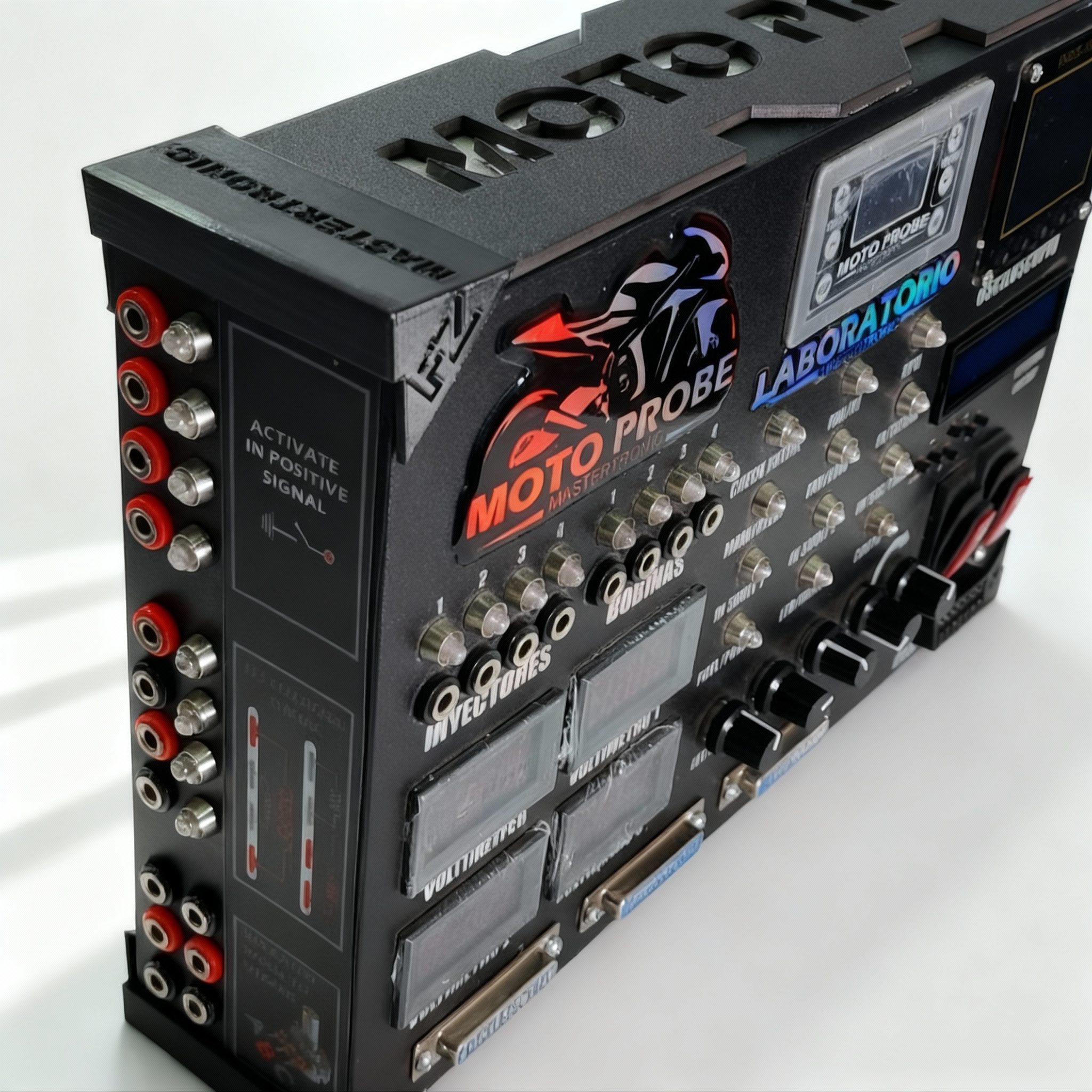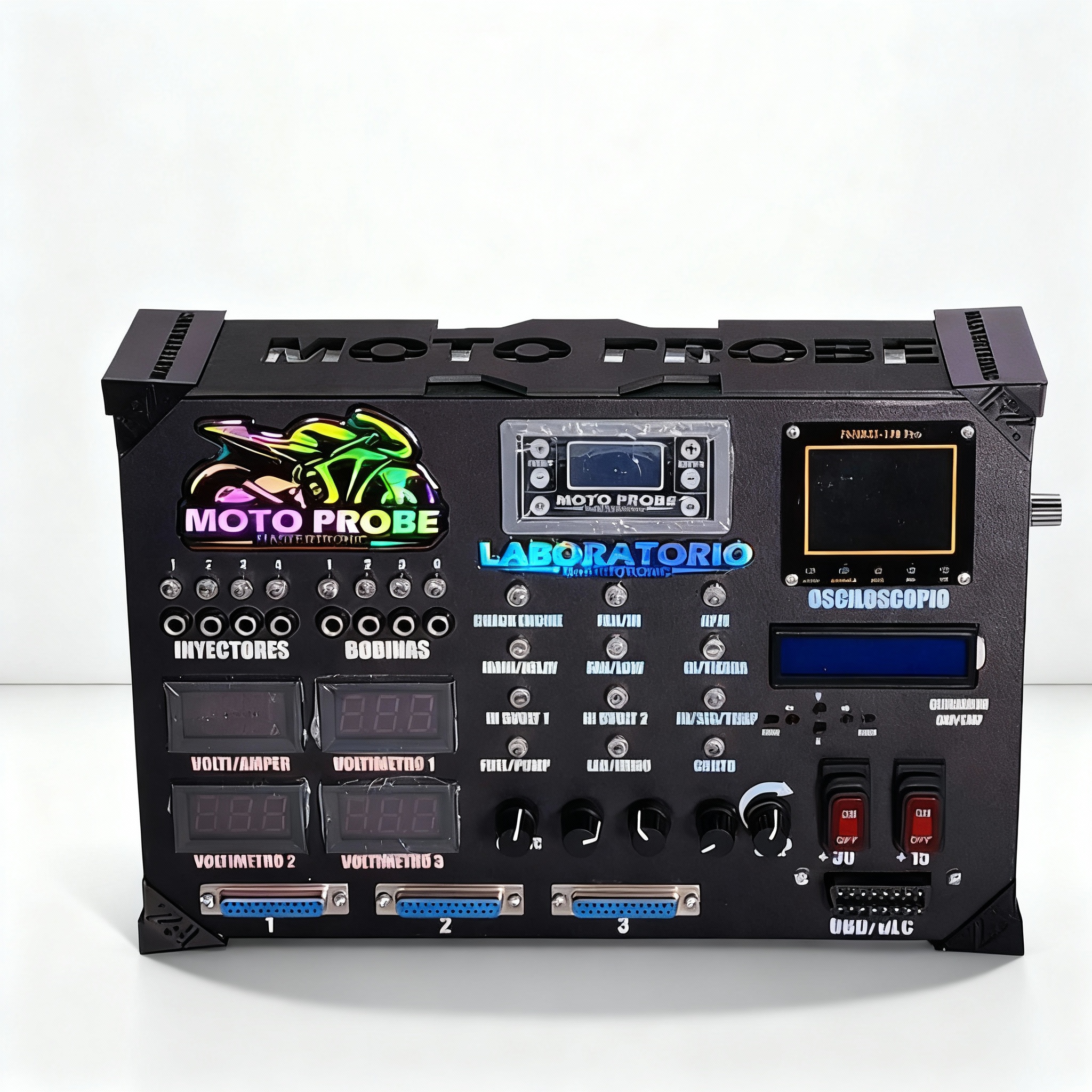 Moto Probe es una estación de diagnóstico y verificación en banco especializada en electrónica de motocicletas. Integra alimentación regulada, generador de señales CKP/CMP, canales de inyección/encendido, comunicaciones OBD-II y un osciloscopio embebido, permitiendo probar y programar módulos fuera del vehículo con total seguridad.