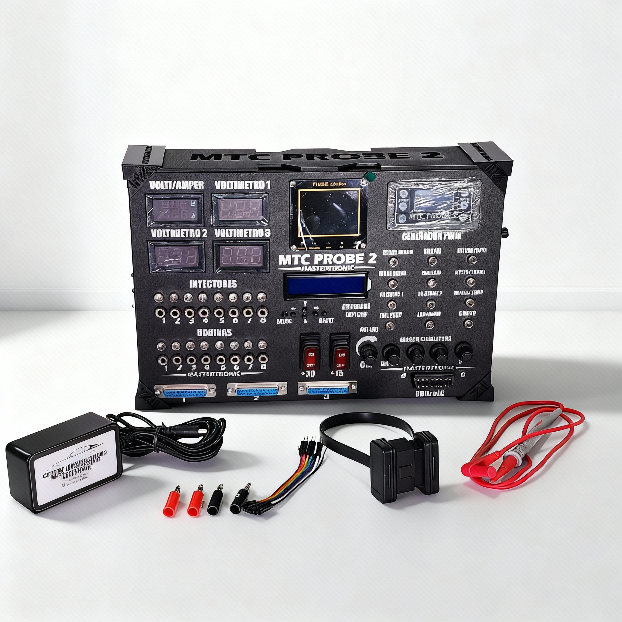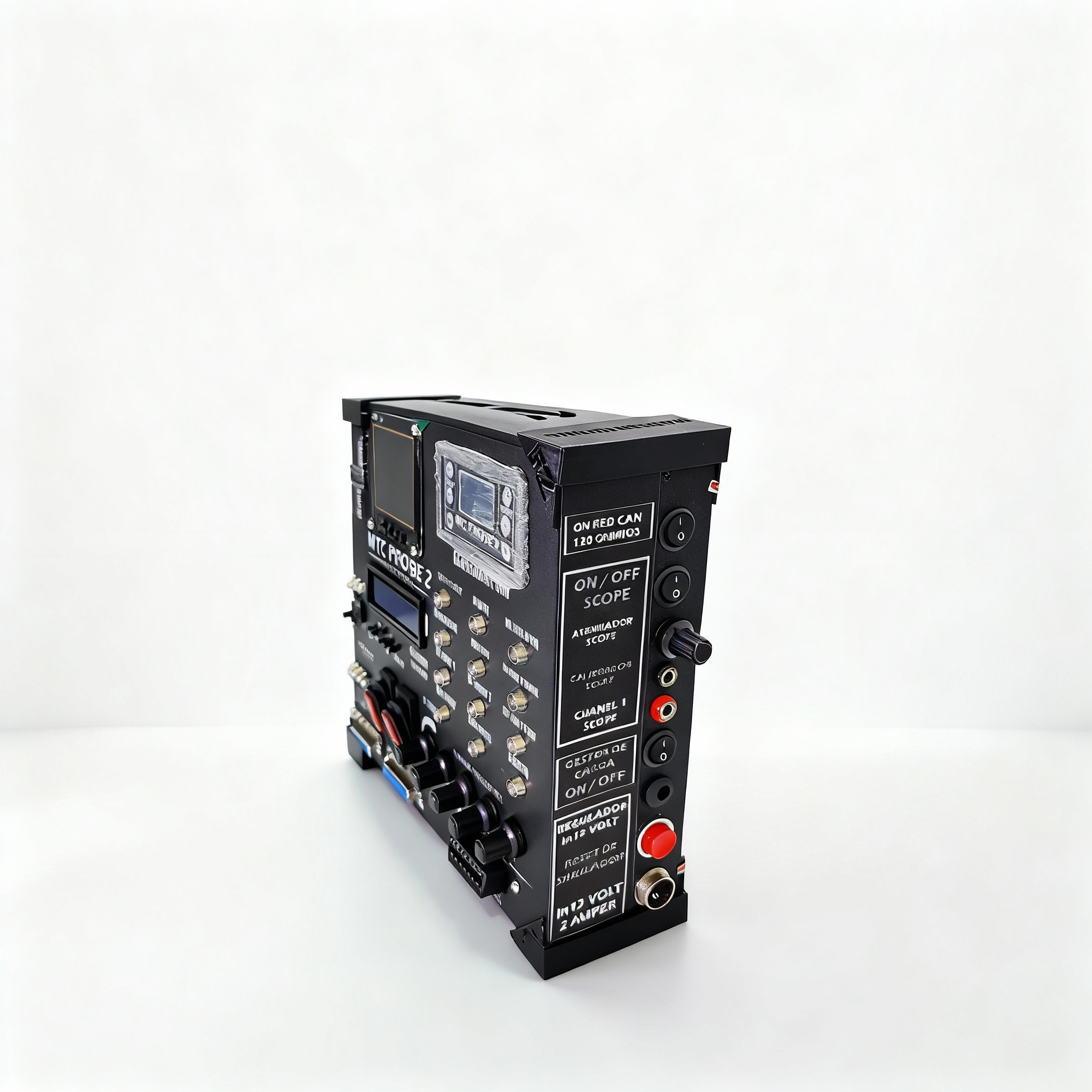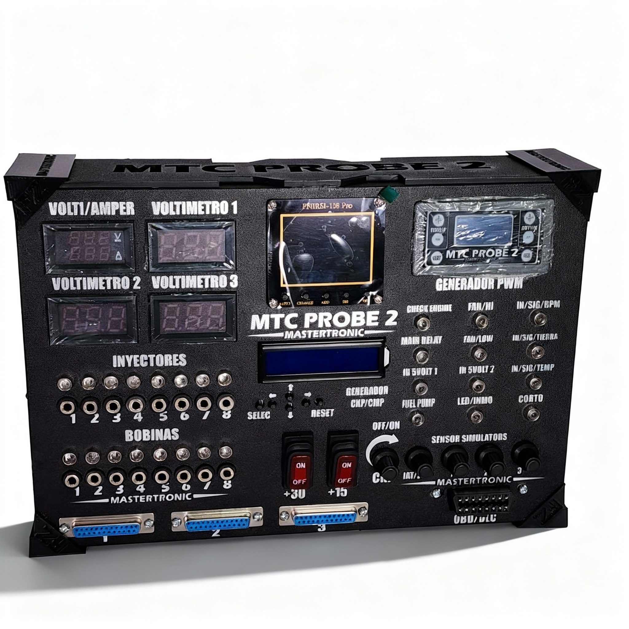 Estación de diagnóstico y verificación en banco de pruebas que centraliza alimentación, medición, control y comunicación OBD-II para computadoras y módulos automotrices ECU, UCH, inmovilizadores, tableros, etc. Diseñada para electro-mecánicos, centros de reparación electrónica y laboratorios de investigación.